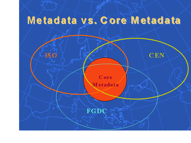 The following figure presents the core in term of a common part of the three main international standards. ![]() Investing in learning the standard or using a standards expert? The majority of standards are very difficult to understand and to implement. That is why many metadata "builders" are hesitating to start the process of learning and implementing several standards. Some have found it more convenient to have the support of standard experts, each of which has personal vision on how to implement a standard. It is necessary to insist in saying that to be used correctly, a standard has to be well documented and promoted and that training facilities have to be provided. It seems this effort is not sufficiently made by the standard makers and in particular by CEN. 2.3 Existing services do not communicateAt present metadata services do not communicate with each other with the result that there is duplication and inconsistency. ESMI has the objective to link existing and future spatial metadata systems. The exploration and implementation of the more appropriate technology are not trivial exercises and need consequent resources. A working application of the linking of remote information services can be seen at the Global Environmental Information Locator Service (GELOS - http://unfccc.gelos.org/). This is the G7- Environment and Natural Resources Management (ENRM) globally distributed virtual library of ENRM data. The alpha-version of GELOS is hosted by the Centre for Earth Observation of the European Union and uses the GELOS metainformation attribute set to describe its resources. The long-term result of this effort will be a virtual library of ENRM information held in globally distributed sites that are accessible via increased electronic linkage between networks and thus integrate distributed ENRM data and information databases. 2.4 Capturing and maintaining metadata is not always seen as a priority by data producersMetadata capture and maintenance is still seen as a time consuming and consequently expensive activity. The fact that in the public sector in which a large part of geographic information is produced the creation and maintenance of metadata is not a legal obligation (in the majority of the cases) does not help. For those organisations who have a culture of describing and disseminating their information it is often the case that old methods and technologies are in place since a long time and it seems difficult to change the situation, in particular with regard to the personnel issues. The necessity for data producers to have access to, and to use, capture and maintenance tools at a very low cost is identified as a success factor. 2.5 Minimum collaboration with users during the definition and implementation phases: a user-friendly focus is neededUser-friendly interface For a non-professional user, finding the information wanted is very difficult. Even if 'Help' or 'Tutorial' can be found in some metadata services such as EWSE, it is not very easy to understand what to do and where to type. Efforts must be made to explain what to ask for and to develop user-friendly and multi-lingual interfaces. If it takes too much time to understand how to react to metadata services, users will not stay long and will immediately complain! A dictionary, multilingual thesauri or catalogues with keywords, should be provided to users to ensure that the same vocabulary is used. One of the most important things is to develop services that are not technology dependent and technology driven. Projects must be done in collaboration with users (who must first be identified). User-expected content Are we certain that the metadata content now available from the various existing services is that expected by the users? It seems that the current tendency is to propose a complex database approach that seems to be very 'data producer oriented'. One can imagine that users are more interested in examples and benefits on how to use the proposed data sets than a detailed description of its structure and content. To our knowledge a study on feedback from users of the existing services in Europe does not exist. 2.6 Potential users are facing initiatives which are not well documented and advertisedThe aim, end product and inter-relation of each project are not sufficiently clearly documented. It is not obvious for users to understand and identify the most appropriate service for their needs. 2.7 Doing business with metadata seems impossibleWith the exception of selling expertise in implementing standards and developing metadata services, there is a general opinion that selling metadata is not a feasible business model. 2.8 Metadata for applicationsA new tendency is to adapt the metadata structure and content to applications, for example, electronic commerce or data management within an organisation. Metadata that is created to satisfy a real need, rather than because it is seen as something that should be done in the general interest, is more likely to be well-written and maintained. 2.9 Several metadata descriptions of the same data setAcross the existing services there are likely to be different metadata descriptions of the same data set, e.g., metadata descriptions from the Portuguese national mapping agency in the SNIG service and the GDDD. 2.10 Lack of a GI product identification mechanismThere is no mechanism to provide identification numbers (Id) to the different GI products produced and offered to users. This missing element is a very important issue for those who are implementing in parallel a metadata service and an e-commerce solution. 3. Solutions - Proposals3.1 Seek consensus as to with which standard Europe should be workingQuarrelling during too long a period about using one standard or another (CEN versus ISO) and a language or another (EXPRESS versus XML) will not help the implementation and development of metadata services. It is time to seek consensus on with which standard Europe should be working. 