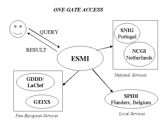 The ESMI project was launched in 1998 in the framework of the INFO2000 programme. The INFO2000 projects are supported with the aim of improving access to European geographic information. ESMI will link spatial data users with metadata services using Internet. ![]() The figure above shows the ESMI intention to link existing metadata services. It was planned to have a prototype available by the end of 1998 but the project is unfortunately late. It is expected to have a workable prototype during the second half of 1999.